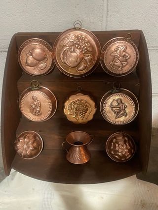 Set di stampi in rame per dolci, perfetti per dare un tocco vintage alla tua cucina. Raffigurano frutta e figure classiche. - Materiale: Rame - Design: Frutta (limoni, mele, uva) e figure mitologiche - Include un piccolo bricco in rame