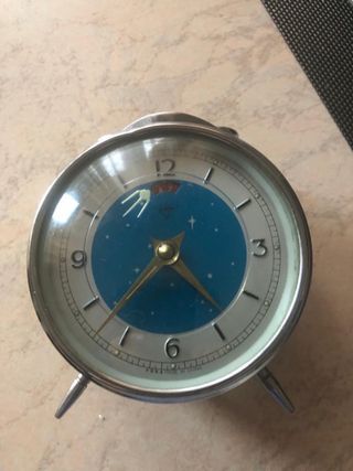 Sveglia da tavolo dal design unico ispirato allo spazio. Presenta un quadrante blu con stelle e un satellite stilizzato. - Cassa in metallo. - Lancette dorate. - Base con piedini. Funziona