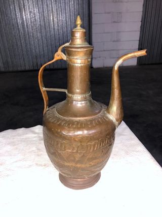Raffinata brocca antica in rame, con dettagli finemente incisi che ne esaltano l'eleganza. - Materiale: Rame - Design: Orientale - Decorazioni: Motivi floreali e geometrici incisi