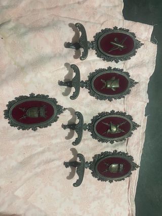 Set di quattro appendiabiti antichi in metallo con base in velluto bordeaux e decorazioni a forma di stemmi. - Design ovale con cornice decorata. - Ogni appendiabito presenta un simbolo diverso. - Ideali per un tocco vintage.