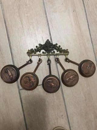 Set di 5 misurini in bronzo con decorazioni di auto d'epoca. - Ogni misurino presenta un'incisione diversa di un'auto storica. - Il manico è collegato a un anello decorativo. - Ideali per collezionisti o come elemento d'arredo.