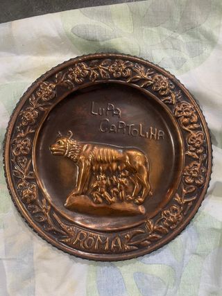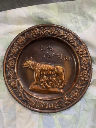 Piatto decorativo in rame con la rappresentazione della Lupa Capitolina e Romolo e Remo. - Raffigurazione della Lupa Capitolina. - Scritta ROMA sul bordo inferiore. - Cornice decorata con fiori e foglie.