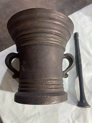 Antico mortaio e pestello in bronzo, con manici laterali e finiture a rilievo. - Materiale: bronzo - Design decorativo a fasce
