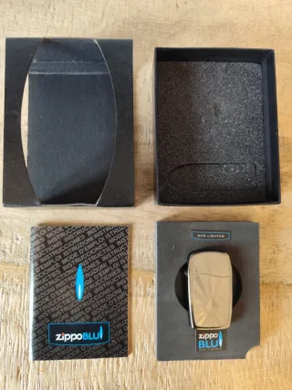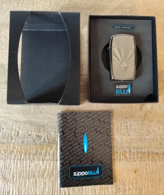 Modello: Zippo BLU High Polish Chrome con incisione Geometrica "Sunburst". Anno di Produzione: Agosto 2006 (Codice fondello: H 06). Rarità: Esemplare di pre-serie prodotto prima del lancio ufficiale del 2007, identificabile dalla data 2006 sul fondello. Sistema di Accensione: Tecnologia a gas butano con fiamma "torch" blu antivento e accensione a pietrina.