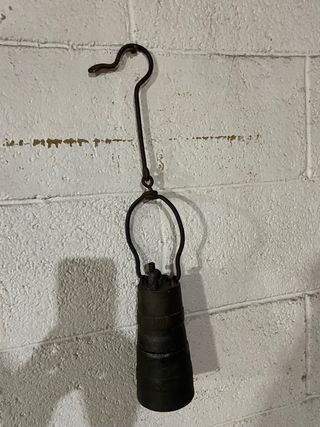 Lampada antica da minatore, realizzata in metallo scuro. Ideale per collezionisti o come pezzo d'arredo vintage. - Struttura in metallo. - Gancio per sospensione.