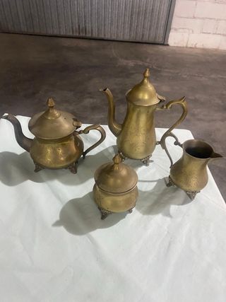 Elegante set di teiera e zuccheriera in ottone, con decorazioni finemente incise. - Teiera con coperchio e manico. - Zuccheriera con coperchio e pomello. - Brocca aggiuntiva inclusa. - Materiale: ottone.