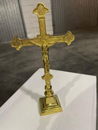 Elegante croce da altare in ottone dorato, con base quadrata. - Materiale: Ottone dorato - Base: Quadrata - Stile: Religioso Altezza 32-16 cm