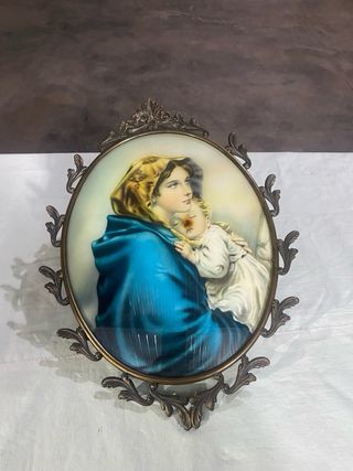 Bellissimo quadro raffigurante la Madonna con Bambino, incorniciato da una elegante cornice barocca. - Stile: Religioso - Cornice: Metallo lavorato - Forma: Ovale 41-30 cm