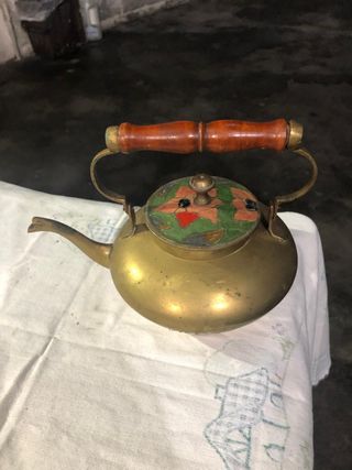 Bollitore in ottone con un manico in legno e un coperchio decorato. - Materiale: Ottone - Manico: Legno - Coperchio: Decorato con motivi floreali