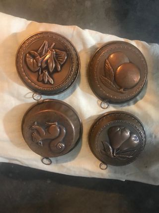 Set di 4 stampi in rame per dolci, con decorazioni a tema. - Stampi rotondi in rame. - Decorazioni: grappolo d'uva, mele, pere e uno scoiattolo. - Anelli per appenderli inclusi.