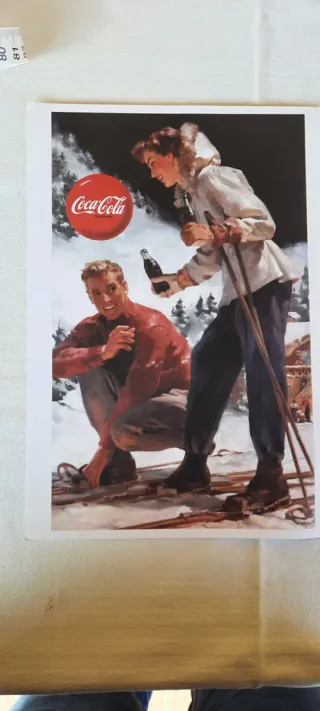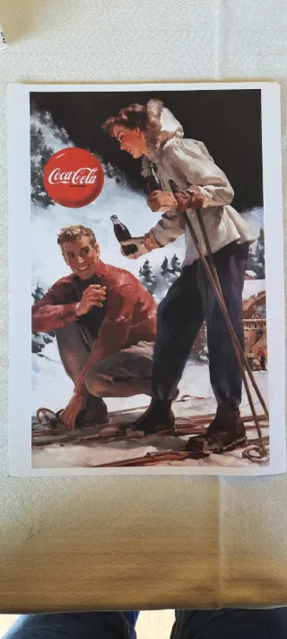 Stampa pubblicitaria vintage Coca-Cola con tema sciistico. Raffigura una coppia di sciatori in montagna. - Logo Coca-Cola presente. - Illustrazione a colori.