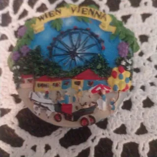 Souvenir di Vienna con la famosa ruota panoramica. - Raffigura la ruota panoramica e scene di vita cittadina. - Scritta Wien Vienna in evidenza.
