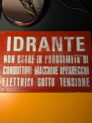 Targa metallica vintage con la scritta IDRANTE. - Materiale: Metallo - Scritta: IDRANTE - Testo aggiuntivo: NON USARE IN PROSSIMITA DI CONDUTTORI MACCHINE APPARECCHI ELETTRICI SOTTO TENSIONE