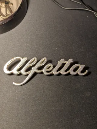 Scritta Alfetta originale Alfa Romeo in metallo cromato. - Logo Alfa Romeo. - Finitura cromata lucida.