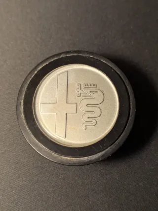 Pulsante clacson con logo Alfa Romeo. - Design circolare. - Finitura metallica. - Dettaglio del simbolo Alfa Romeo.