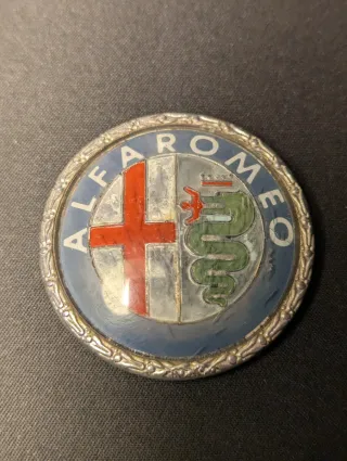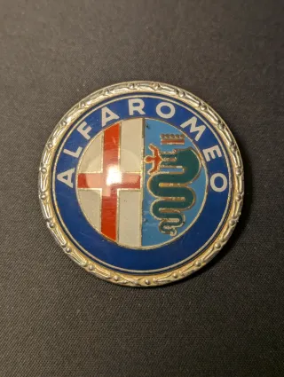 Emblema originale Alfa Romeo Milano. - Logo circolare con scritta ALFA ROMEO. - Raffigurazione della croce di San Giorgio e del biscione.