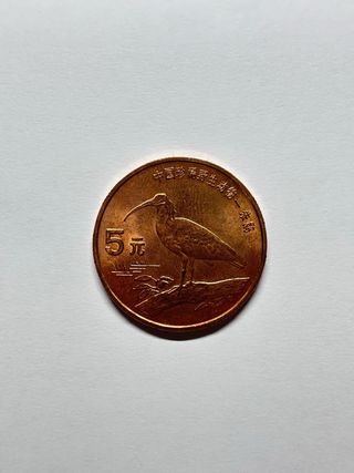 Moneta cinese da 5 Yuan del 1997, serie lista rossa - Ibis Crested. - Dritto: Ibis Crestato su un ramo. - Rovescio: Valore nominale 5元 e iscrizione 中國珍稀野生動物-朱锋.