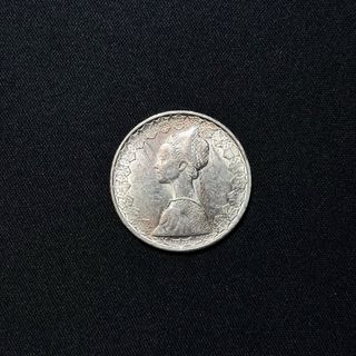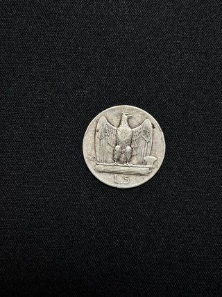 Moneta da 5 Lire del Regno d'Italia, coniata nel 1929. Aquilotto - Realizzata in argento. - Raffigura un'aquila con fascio littorio.