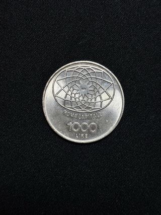 Moneta commemorativa da 1000 Lire, coniata nel 1970 per Roma Capitale. - Dritto: Raffigurazione stilizzata di un globo terrestre con un motivo geometrico. - Rovescio: ROMA CAPITALE, 1000 LIRE e l'anno 1970.