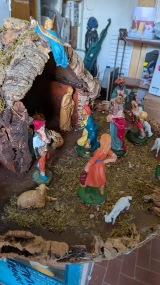 Bellissimo presepe artigianale, completo di statuine e ambientazione. - Realizzato a mano con cura dei dettagli. - Include personaggi come la Sacra Famiglia, i Re Magi e pastori. - Ambientazione rustica con grotta e dettagli naturali.