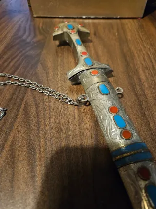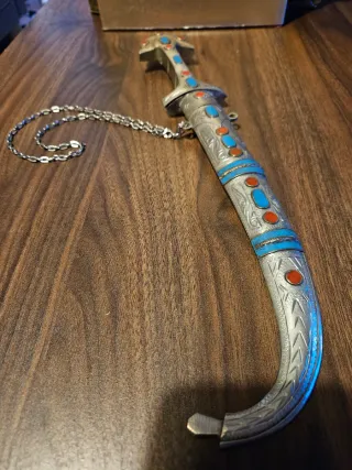 Antico pugnale con decorazioni e pietre incastonate. Un pezzo unico con una catena. Bellissimo da regalo 🎁 provenienza yemenita - Manico decorato con pietre blu e rosse. - Fodero in metallo con incisioni. - Catena in metallo collegata al manico.