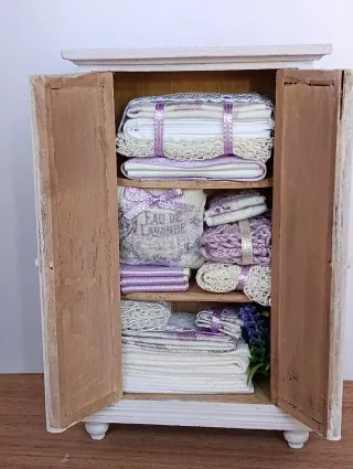 Delizioso armadietto in miniatura, dipinto a mano con motivi floreali. Completo di biancheria - Colore lilla - Dettagli floreali viola e arancioni. - Ante apribili. - Ripiani interni.