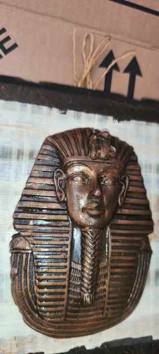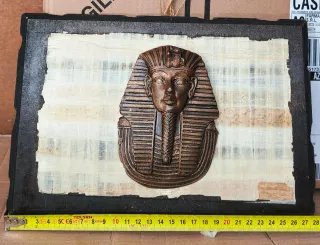 Egitto Faraone Si tratta di una riproduzione in resina della maschera funeraria di Tutankhamon, montata su una piccola base di papiro. Rappresenta il volto idealizzato del giovane faraone con i simboli della regalità egizia. Simboleggia l'immortalità e la divinità del faraone. .