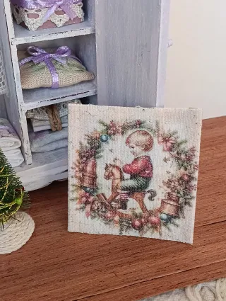 Miniatura di un quadretto in tela con una scena natalizia. - Raffigura una bambina che addobba un albero di Natale. - Presenta pacchi regalo alla base dell'albero. - Decorato con una stella in cima all'albero.