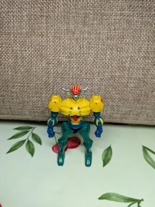 Action figure di un robot con dettagli colorati. - Colore principale giallo. - Dettagli blu e verdi. - Testa rossa e argento.