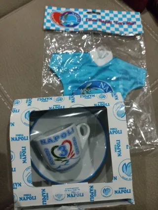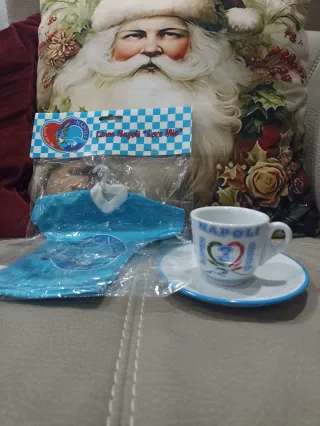 Set tazzina da caffè e piattino con logo Napoli Core Mio. - Tazzina in ceramica bianca. - Piattino bianco con bordo blu. - Decorazione con logo Napoli e cuore tricolore.