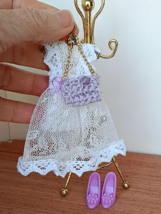 Delizioso abitino in pizzo bianco, perfetto per collezioni in miniatura. Include accessori coordinati. - Abito in pizzo bianco con fiocco lilla. - Borsa a tracolla in miniatura. - Scarpe lilla in miniatura.