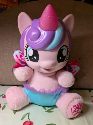 Morbido peluche di My Little Pony, perfetto per i più piccoli. Ha un design adorabile con ali e corno scintillante. - Colore principale: rosa. - Dettagli colorati su criniera e ali. - Logo My Little Pony sul piedino.