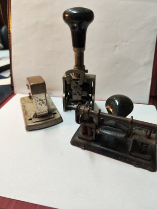 Set di tre pezzi da ufficio risalenti agli anni '60. Oggetti vintage ideali per collezionisti o per dare un tocco retrò al proprio spazio. Composto da Timbro datario, spillatrice Zenit e foratore. - Stampatrice numeratrice Zenith. - Perforatore da tavolo. - Altro timbro da ufficio.