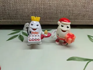 Due simpatici personaggi Kinder Sorpresa, perfetti per collezionisti. - Un personaggio con corona e vassoio di ovetti. - Un personaggio con cappello di Babbo Natale e regalo.