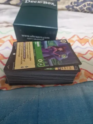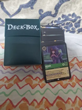 Vendo deck box Ultra Pro e 100 carte del gioco Lorcana. - Deck box di colore verde. - Carte del gioco Lorcana.