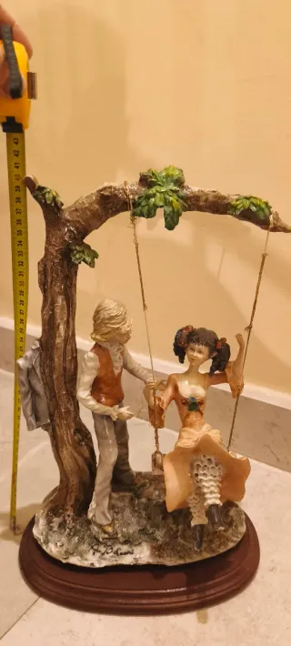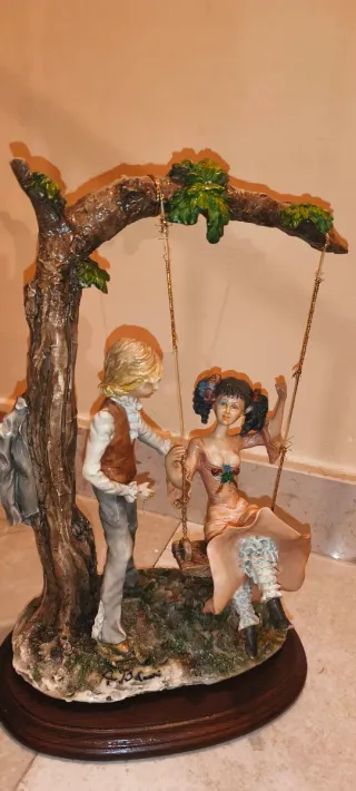 Scultura dipinta a mano raffigurante due innamorati un uomo e una donna su un'altalena, creata dall'artista Auro Belcari in Italia. Questo pezzo fa parte della collezione "Swing" o "Dear Sculpture Artistiche". Dettagli del Prodotto Artista: Auro Belcari Materiale: Resina di altissima qualità liscia e sinuosa al tatto. Dimensioni: Altezza cm 40 (16 pollici). Scultuta Made In Italy decorata a mano, con base in legno. In ottime condizioni, senza rotture né scheggiature.