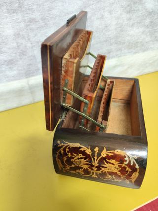 Elegante cofanetto antico per sigarette, con raffinati intarsi. Con segi del tempo,ma in buone condizioni. Misure 21x11x8 cm chiuso - Realizzato in legno scuro. - Intarsi decorativi sul corpo. - Interno a più livelli per l'organizzazione.
