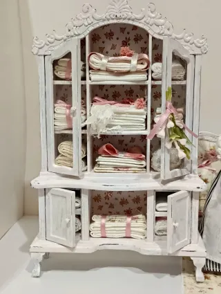 Credenza in miniatura per casa delle bambole, perfetta per arredare con stile. - Design bianco con dettagli decorativi. - Ripiani e cassetti per organizzare gli oggetti. - Ante apribili per un maggiore realismo.