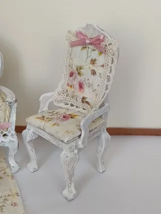 Deliziosa sedia in miniatura, perfetta per una casa delle bambole. Presenta un tessuto floreale con rose rosa e bianche, rifinito con un bordo in pizzo bianco e un fiocco rosa. - Design floreale con rose. - Dettagli in pizzo. - Fiocco decorativo rosa.