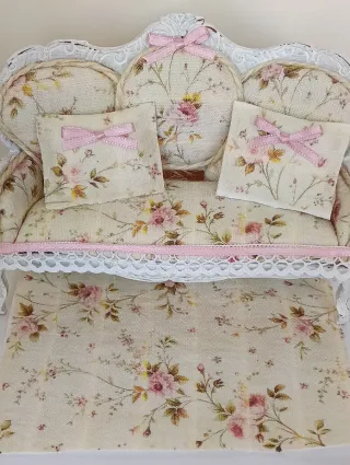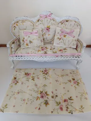Delizioso divano in miniatura con un grazioso motivo floreale. Perfetto per collezionisti o per creare scene in casa delle bambole. - Design floreale con rose e fiori rosa. - Include due cuscini decorativi con fiocchi rosa. - Finitura bianca anticata sulla struttura.