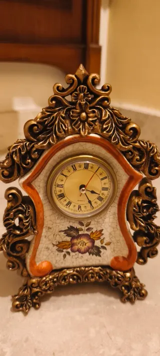 Orologio Da Tavola Con Movimento A Quarzo decorativo in stile classico, in porcellana corpo centrale e resina con finitura in foglia oro la cornice. Presenta un design elaborato con dettagli floreali e un quadrante con numeri romani. La base e la struttura sono decorate con volute e finiture dorate che ne accentuano lo stile ornamentale. Il quadrante indica che si tratta di un meccanismo al quarzo ("QUARTZ"). Articolo da regalo o decorazioni per la casa con un tocco vintage o antico. Rifinitura colore rosa antico o verde antico.