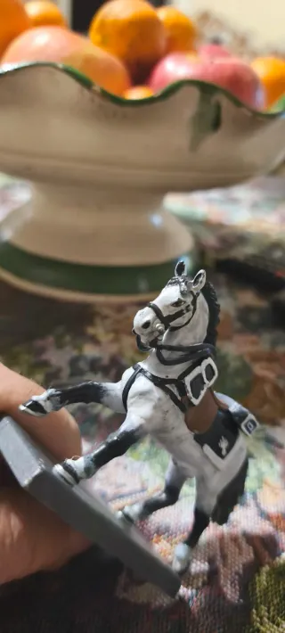 Miniatura vintage di Cavallo da collezione in Metallo marcato Archibugiere A Cavallo Dea By Cassandra, decorato a mano con smalto vari colori. Misure altezza cm 9 larghezza cm 10 peso 180 grammi .
