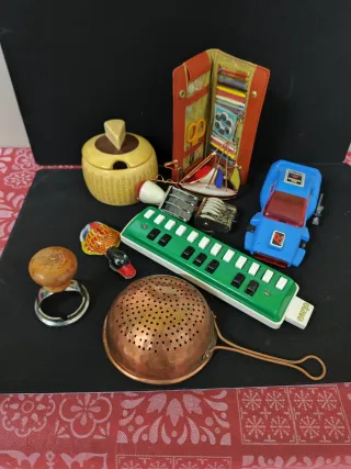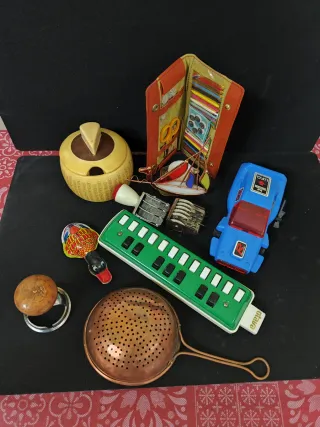 Lotto composto da 10 oggetti vintage di vario genere. - Porta formaggio in ceramica. - Set da cucito portatile. - Melodica metallo verde. - Macchinina blu a corda - Colino in rame. - Giocattolo tic-tac papera. - taglia pasta in legno con anello. -portacandela barca decorativa in metallo e vetro. -2 timbri per datario