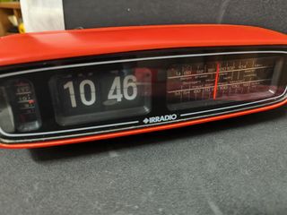 Radio sveglia vintage Irradio con design flip clock tipico degli anni '70. Un pezzo da collezione per gli amanti del design retrò. - Cassa in plastica rossa. - Quadrante con orologio digitale flip. - Selettore radio FM/AM con stazioni indicate. - Logo IRRADIO ben visibile.