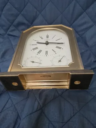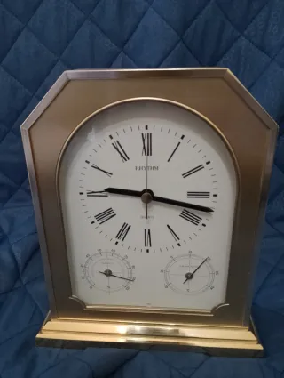 Elegante orologio da tavolo Rhythm con finitura dorata. - Quadrante con numeri romani. - Due indicatori aggiuntivi per umidità e temperatura. - Design classico e raffinato.