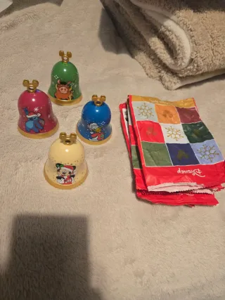 Set di 4 campanelle natalizie a tema Disney, parte della collezione Conad. - Campanella rossa con Stitch. - Campanella verde con Pumbaa. - Campanella blu con Paperino. - Campanella panna con Topolino.