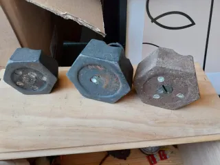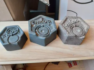 Set di antichi pesi in ghisa, ideali per collezionisti o per uso decorativo. - Materiale: Ghisa - Forma esagonale - Marchi visibili sui pesi