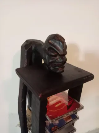 Originale scultura in legno di fattura africana, per riporre 30 CD. - Design unico e artistico. - Realizzata in legno scuro. - Struttura di una figura africana stilizzata.