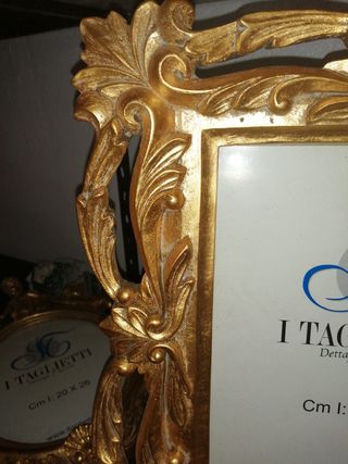 Elegante cornice portafoto con finiture dorate e dettagli barocchi. - Stile: Riproduzione artistica. - Colore: Oro. - Dimensioni interne: 20 x 26 cm. dimensioni 36x40
