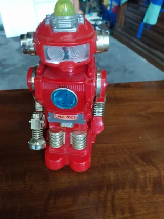 Robot giocattolo vintage, modello Laserbot. Un pezzo da collezione che aggiunge un tocco retrò. Mancante di sportello per le batterie - Colore rosso brillante. - Dettagli metallici dorati. - Design iconico da robot.